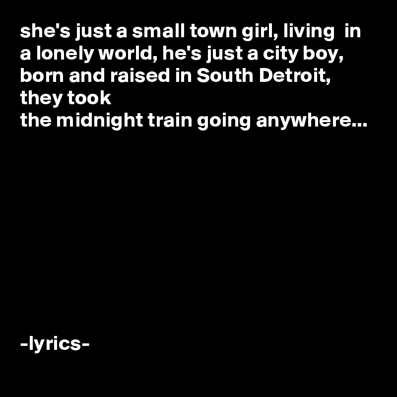 Just a small town girl livin in a lonely world she took the midnight train goin anywhere just a city boy born and raised in south detroit he took the midnight train goin anywhere. Just a small town girl livin in a lonely world she took a midnight train going anywhere just a city boy born and raised in south detroit h.