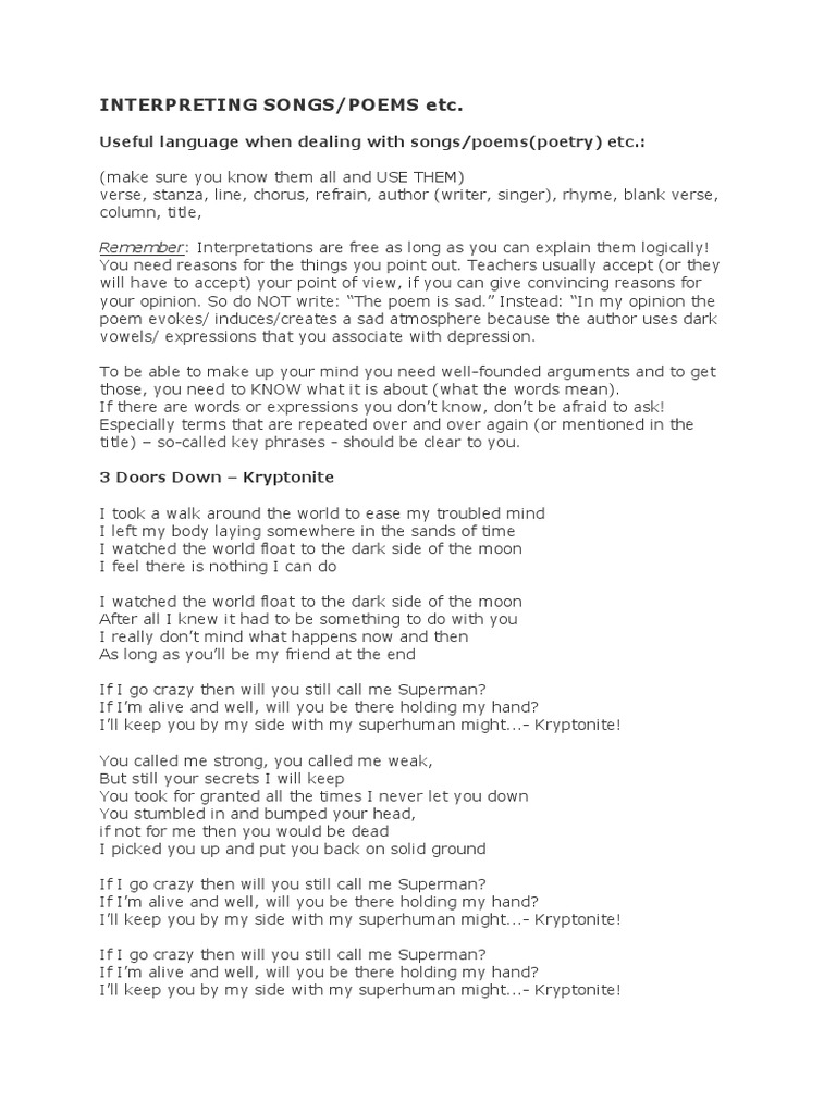 Interpretion Of Kryptonite 7th Or 8th Grade Refrain Poetry