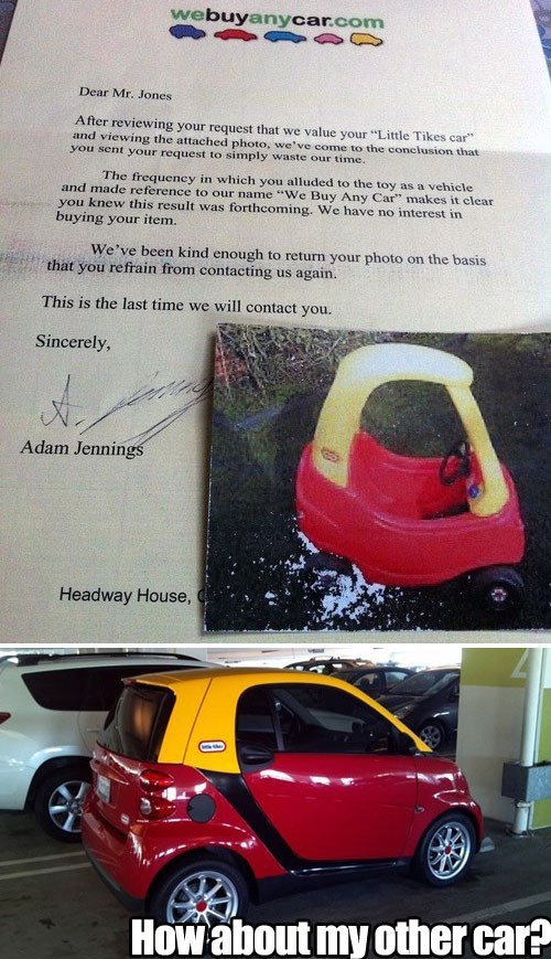 Back in september 2013 buzzfeed writer adam jennings circulated a spoof letter on twitter in which he claimed we declined to buy his lovely tike. We will buy any type of car or truck in any condition wrecked damaged old broken down running or not. We have no interest in buying your item.