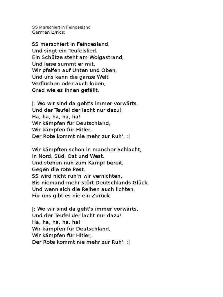 Ss marschiert in feindesland. Ss marschiert in feindesland originally named teufelslied lit. Ha ha ha ha ha. Wir pfeifen auf unten und oben und uns kann die ganze welt verfluchen oder auch loben grad wie es ihnen gefällt.