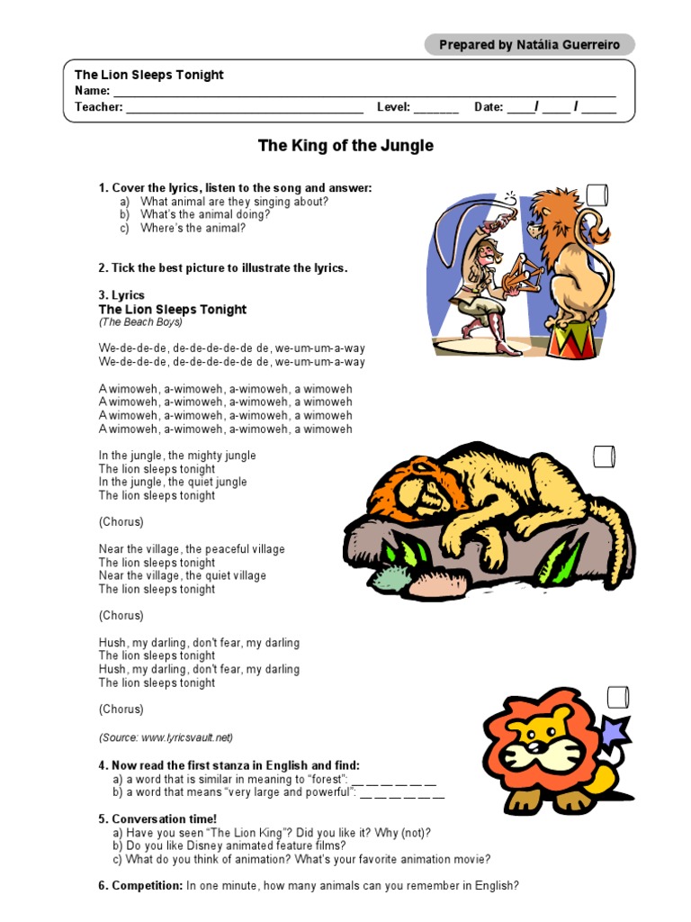 The Lion Sleeps Tonight Lion King Song Esl Worksheet By