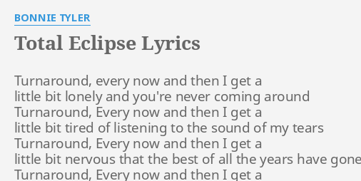 Turn around every now and then i get a little bit nervous that the best of all the years have gone by. Bonnie tyler total eclipse of the heart lyrics. Every now and then i fall apart.