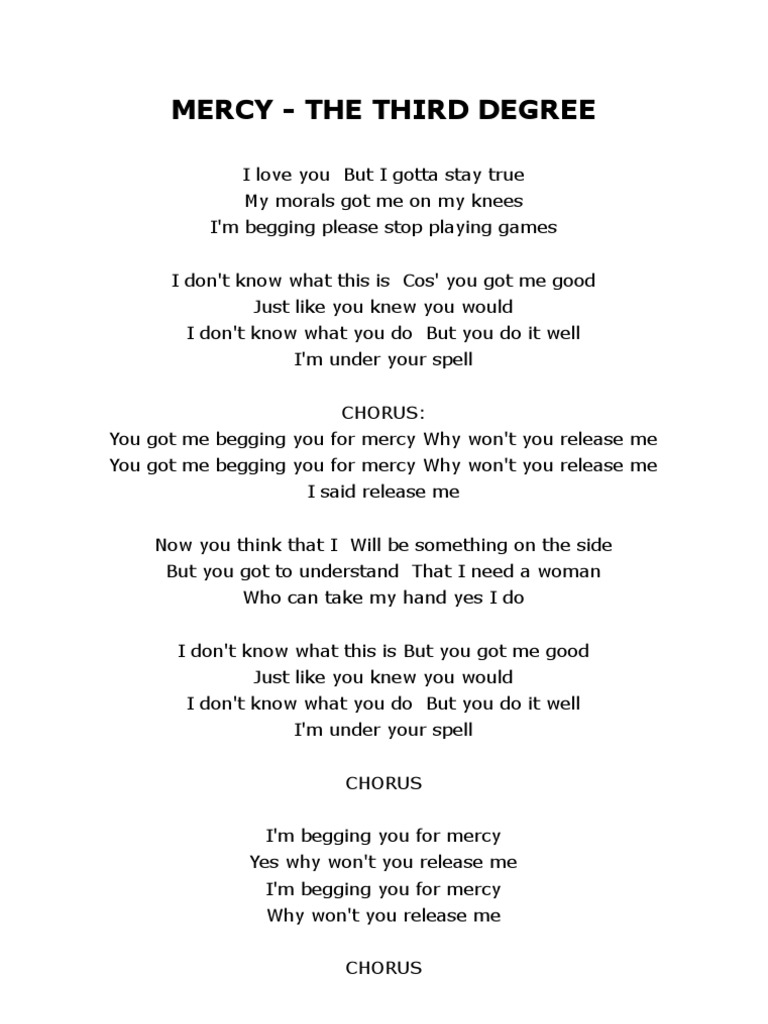 I m begging you for mercy lyrics. Mercy was nominated for several awards in 2008 including the grammy award for best female pop vocal performance at the 51st grammy awards. Well received by the public mercy peaked at number one on the uk singles chart in february 2008 remaining atop the chart for five weeks and went on to become the third best selling single of 2008 in. I m beggin you for mercy i m beggin you for mercy why won t you release me break it down mercy begging you for mercy you got me begging down on my knees i said you got me begging begging you for mercy you got me begging begging you for mercy.