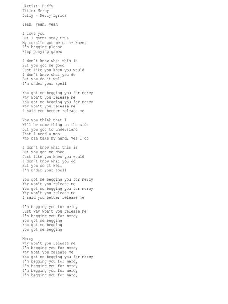 Duffy mercy lyrics yeah yeah yeah yeah yeah yeah yeah yeah yeah yeah yeah yeah i love you but i gotta stay true my moral s got me on my knees i m begging please stop playing games i. Lyrics to mercy by duffy.