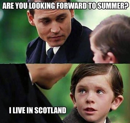 Summer in scotland meme. Both in terms of natural and cultural attractions. See more ideas about scottish bones funny scotland forever. At the height of summer it feels like the sun barely sets with 16 18 hours of daylight.