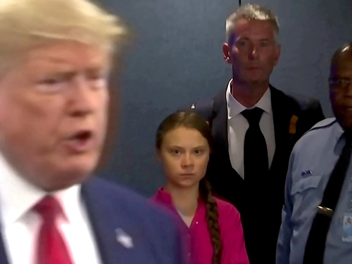 Teen climate activist greta thunberg said it all with her eyes when she saw president donald trump at the united nations climate action summit on monday.