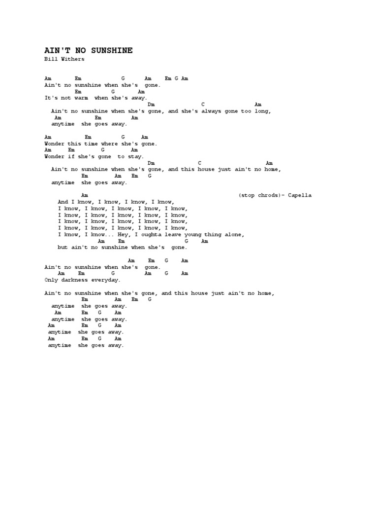 Wonder this time where she s gone wonder if she s gone to stay ain t no sunshine when she s gone and this house just ain t no home anytime she goes away. Simmons earl withers william harrison blackman damon j. Em dm ain t no sunshine when she s gone and she s always gone too long am em em g am anytime she goes away.