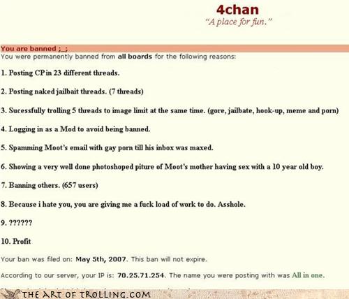 Launched by christopher moot poole in october 2003 4chan hosts boards dedicated to a wide variety of topics from anime and manga to video games music literature fitness politics and sports among others. Getting banned for no reason.