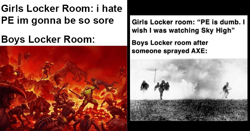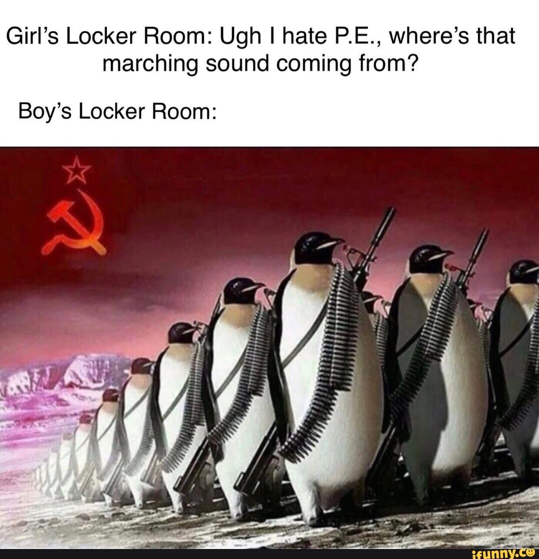 Boys locker room meme. Boys locker room refers to a series of memes metaphorically presenting perceived differences between male and female student locker rooms in a comedic often absurd manner similar to an earlier when teacher says to get out of class format which gained popularity in ironic shitposts in late 2018. The text is usually referring to how girls hate gym class while the boy s side is often depicted with a picture of a war scene. The first english version of the joke appeared on reddit when user lukechrome compared the.
