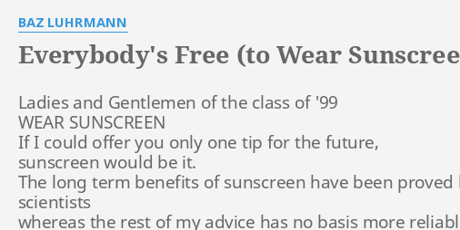 Ladies and gentlemen of the class of 99 br wear sunscreen br if i could offer you only one tip for the future br sunscreen would be it br the long term benefits of sunscreen have been proved by scientists br whereas the rest of my advice has no basis more reliable than my own meandering. Complete your baz luhrmann collection. Lyrics to everybody s free to wear sunscreen by baz luhrmann.