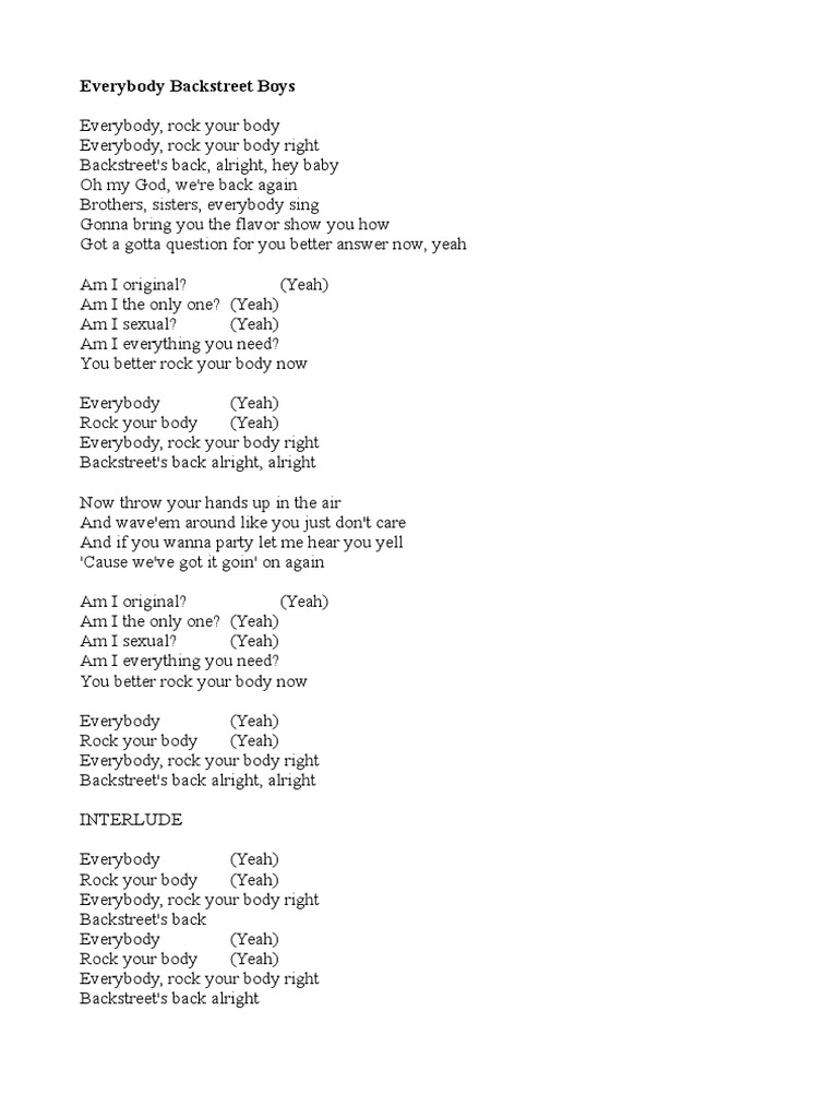 Everybody yeah rock your body lyrics. Everybody backstreet s back lyrics. Everybody backstreet s back lyrics. Everybody yeah rock your body yeah everybody rock your body right backstreet s back alright alright rock your body so everybody everywhere don t be afraid don t have no fear i m gonna tell the world make you understand as long as there ll be music we ll be comin back again everybody yeah rock your body yeah everybody rock your body right.