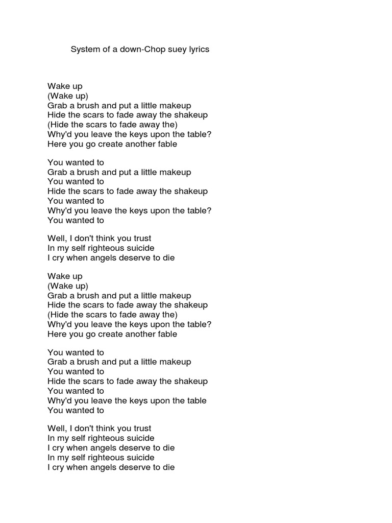 Wake up wake up grab a brush and put a little make up hide the scars to fade away the hide the scars to fade away the shake up why d you leave the keys upon the table. Lyrics for chop suey.