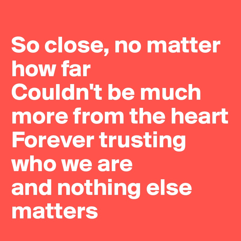 So close no matter how far couldn t be much more from the heart forever trusting who we are and nothing else matters never opened myself this way life is ours we live it our way all these words i don t just say and nothing else matters trust i seek and i find in you every day for us something new open mind for a different view and nothing else matters never cared for what they do never. So close no matter how far shows the connection between two even though hetfield was on tour.