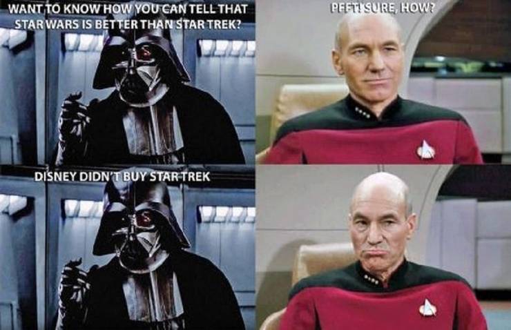 20 most rib tickling star wars vs star trek memes 1. In star trek things are even simpler with the good guys flying disks that have sprouted warp nacelles and the bad guys flying giant cubes. But in this movie still doctored into a meme his mouth is shut pretty effectively by an epic takedown of star trek firepower compared to star wars.