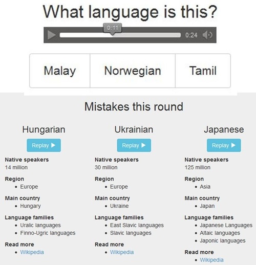 Here s a fun new game to get addicted to. Data scientist lars yencken has created a neat game where you listen to an audio clip and choose which language it is. If you re interested in the game s history you can read more about it here.